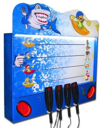 Необходимо имитировать греблю веслом чтобы первым "уплыть" от акулы. Фигурки на поле двигаются в зависимости от интенсивности гребли самого игрока, чем быстрее гребет игрок, тем быстрее двигается его фигурка. Одновременно могут играть до четырех человек.Вас также могут заинтересовать