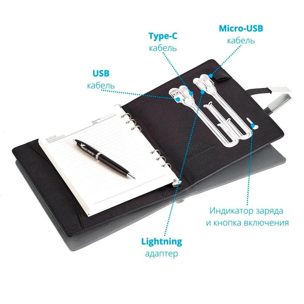 Смарт ежедневник с зарядкой (арт. A2) включает внешний аккумулятор мощностью 8000 mAh, а также ежедневник на разъёмных кольцах. Обложка ежедневника выполнена из высококачественной искусственной кожи сSmart ежедневник с беспроводной зарядкой, флешкой и лампой Lamp Charging