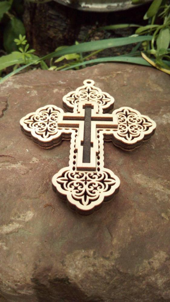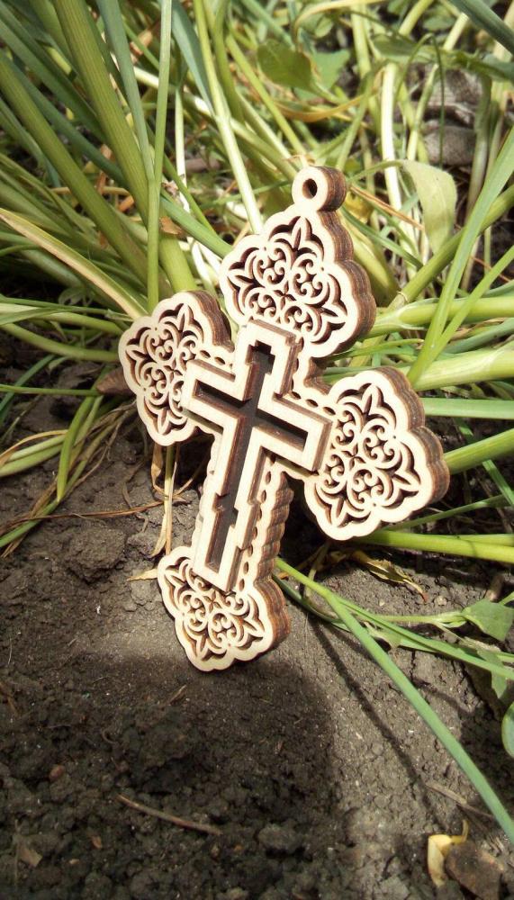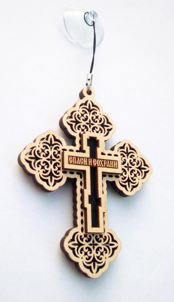 Автомобильный Крест на присоске с прорезанным насквозь орнаментом без распятия с надписью на оборотной стороне спаси и сохрани,выполнен из четырех слоев березовой фанеры,этот оберег станет частью интерьера вашего автомобиля и защитником на дороге.