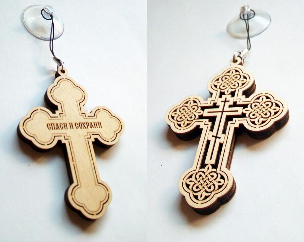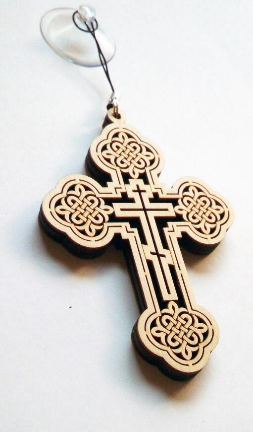 Автомобильный Крест на присоске с прорезанным насквозь орнаментом без распятия с надписью на оборотной стороне спаси и сохрани,выполнен из четырех слоев березовой фанеры,этот оберег станет частью инте