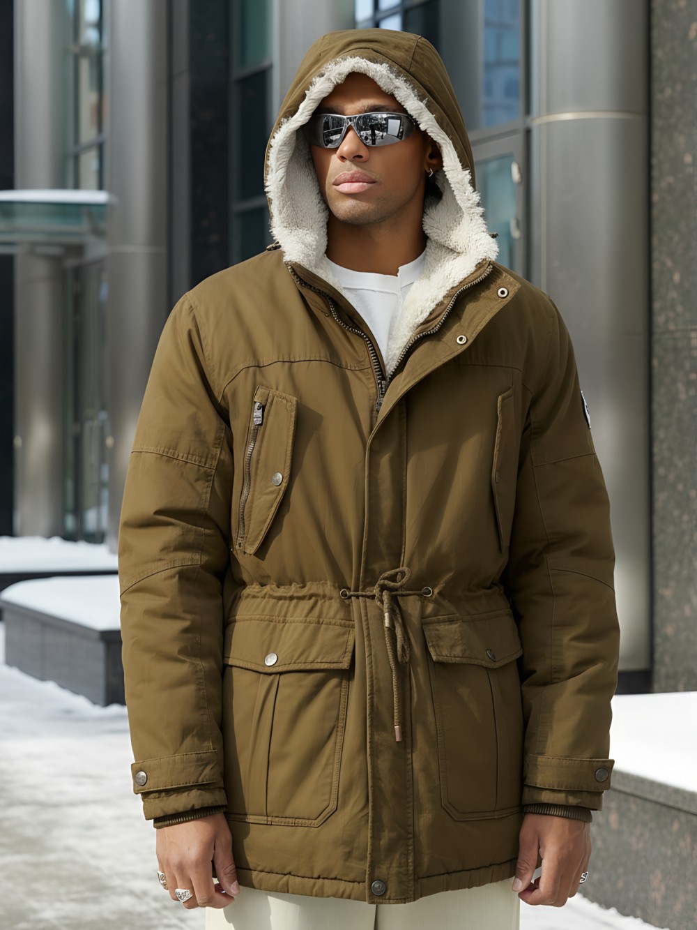 Мужская зимняя парка с меховым капюшоном - идеальный спутник для зимних морозов. Погружайтесь в зимние приключения с нашей стильной мужской паркой, со...